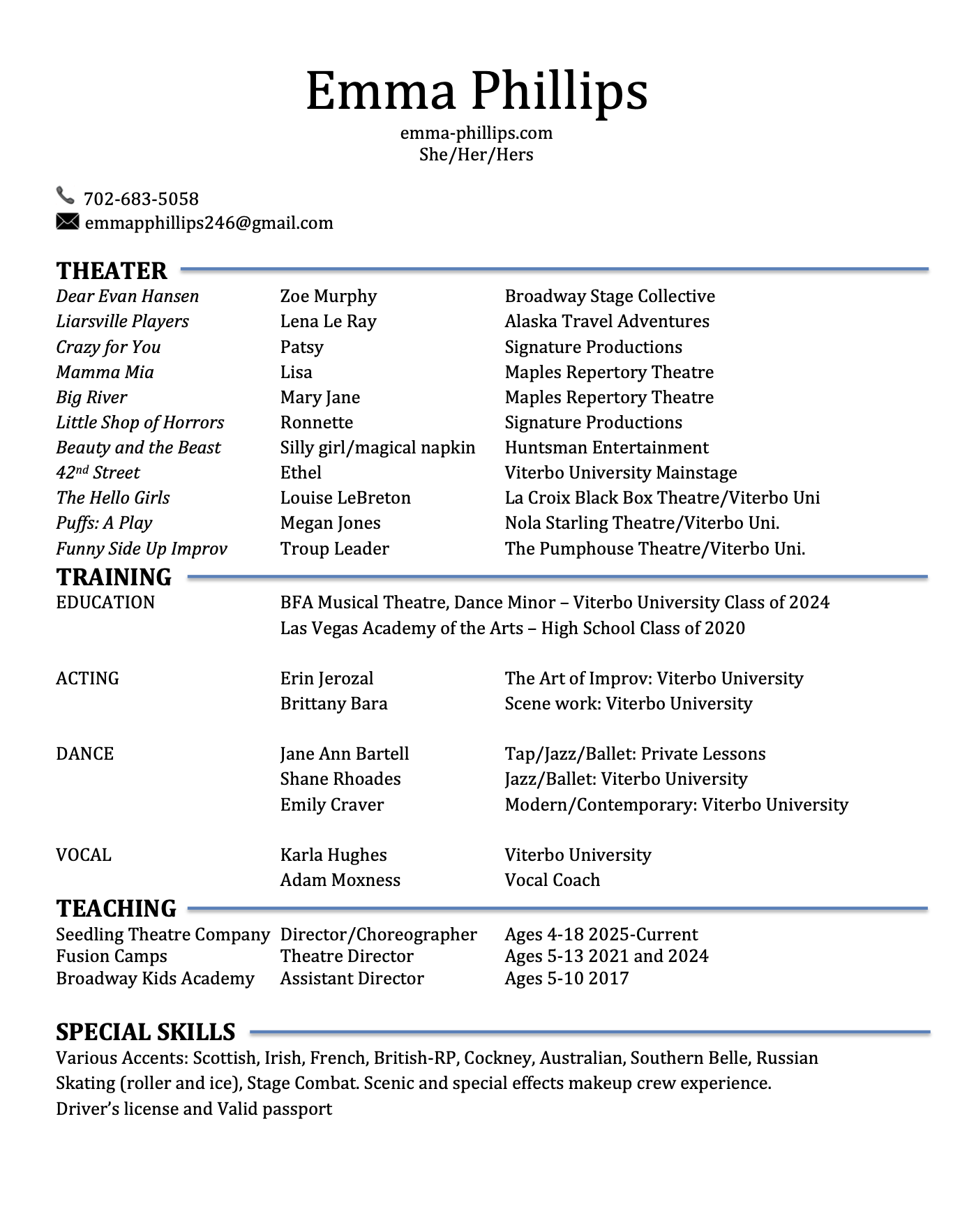 Emma is currently Zoe Murphy in Las Vegas's first ever production of Dear Evan Hansen with Broadway Stage Collective. Zoe has been one of Emma's dream roles since high school and she is so excited to bring her to life! The show is opening March 26th 2026 and tickets can be found by clicking here! She is also currently working at Seedling Theatre Company where she is Co-directing and choreographing Willy Wonka Jr.! To check out the company Emma teaches for or look at her teaching bio click here!ON THE HORIZON...